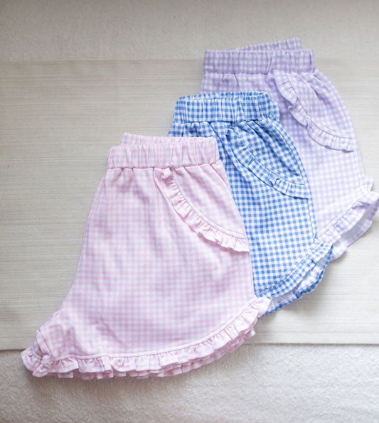 Kinley Ruffled Knit Pima Shorts - Lavender Gingham