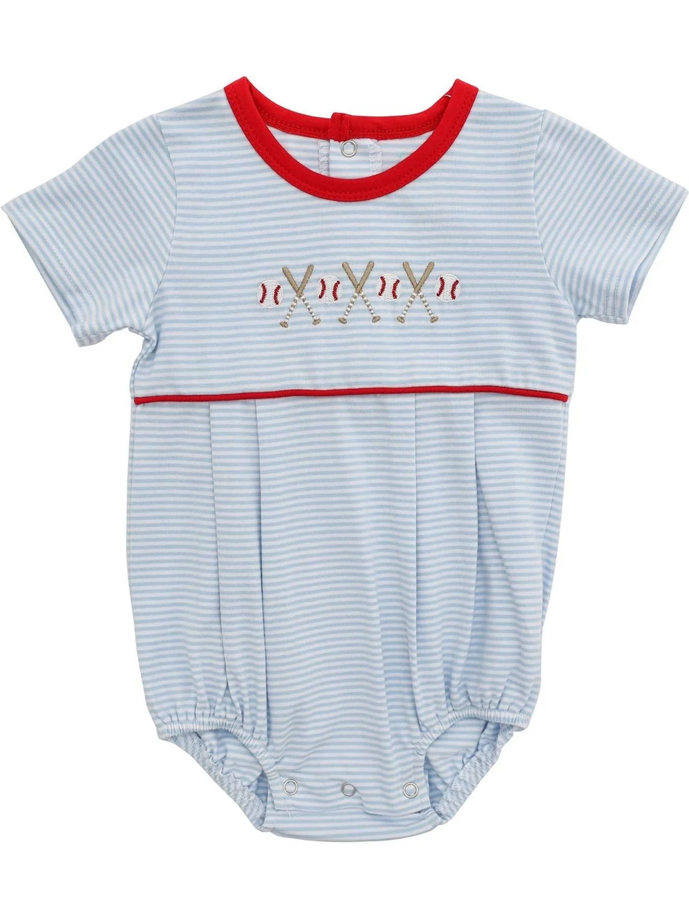 Let your little one swing into style with the Baseball Boy Bubble. This charming piece features a soft light blue striped knit construction adorned with playful baseball embroidery across the front, finished with vibrant red trim at the neckline and chest. Perfect for warm-weather outings, family gatherings, or casual playdates, this bubble combines comfort with timeless sports-inspired appeal. The classic design makes it an easy go-to for any occasion while keeping him looking sharp and feeling great.