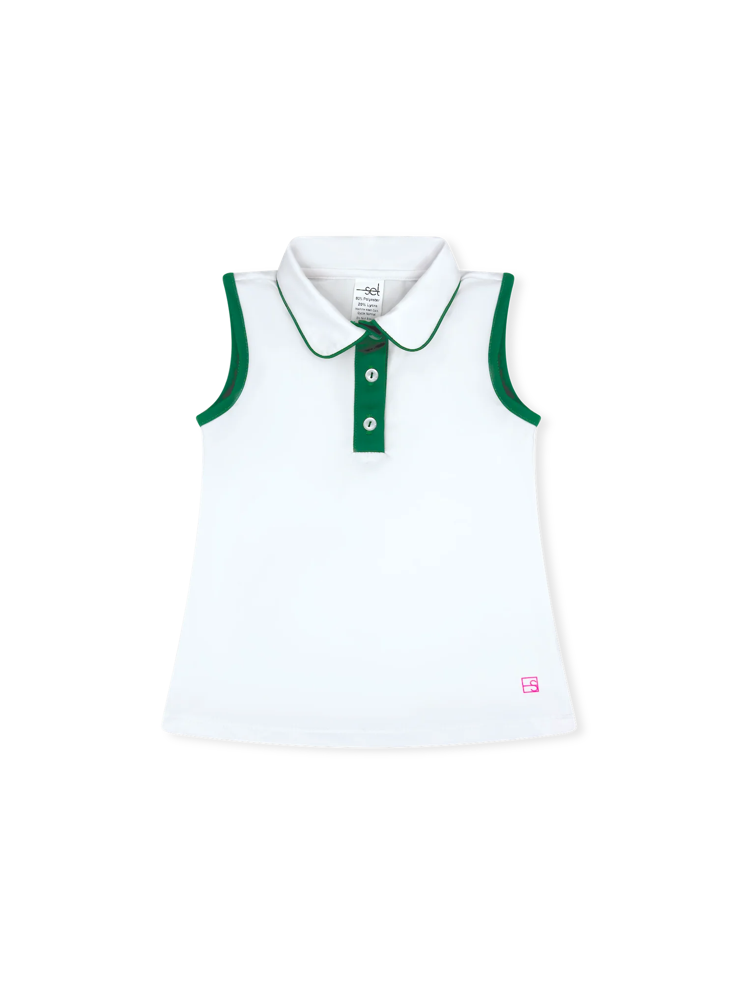 This sleeveless tank brings effortless style to warm-weather days with a polished polo-inspired design. Crafted in soft Pure Coconut with contrasting Augusta Green accents on the collar, button placket, and arm openings, it strikes the perfect balance between sporty and refined. The structured collar and button front elevate any casual outfit, making it ideal for everything from playdates to weekend adventures.