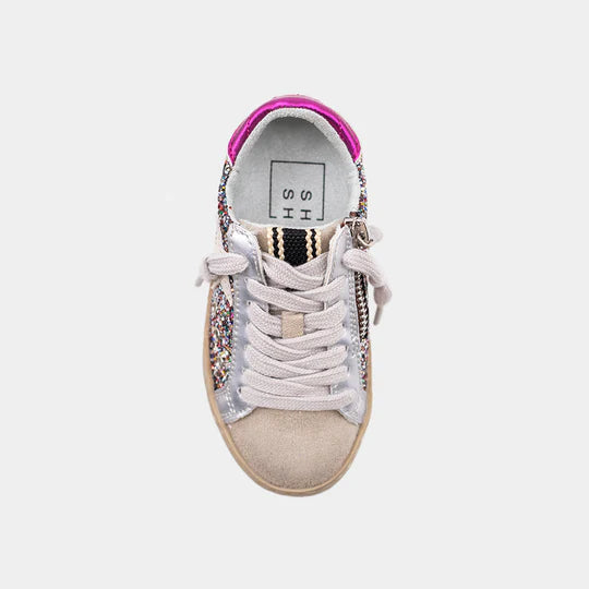 Our MINI styles turn our best-selling sneakers into fun-sized favorites for Kids and Toddlers. The PAULA MINI in Multi dazzles with a glittery mix of colors, adding a playful sparkle to every step. Featuring a sturdy sole and rounded toe for comfort, it's perfect for little trendsetters.