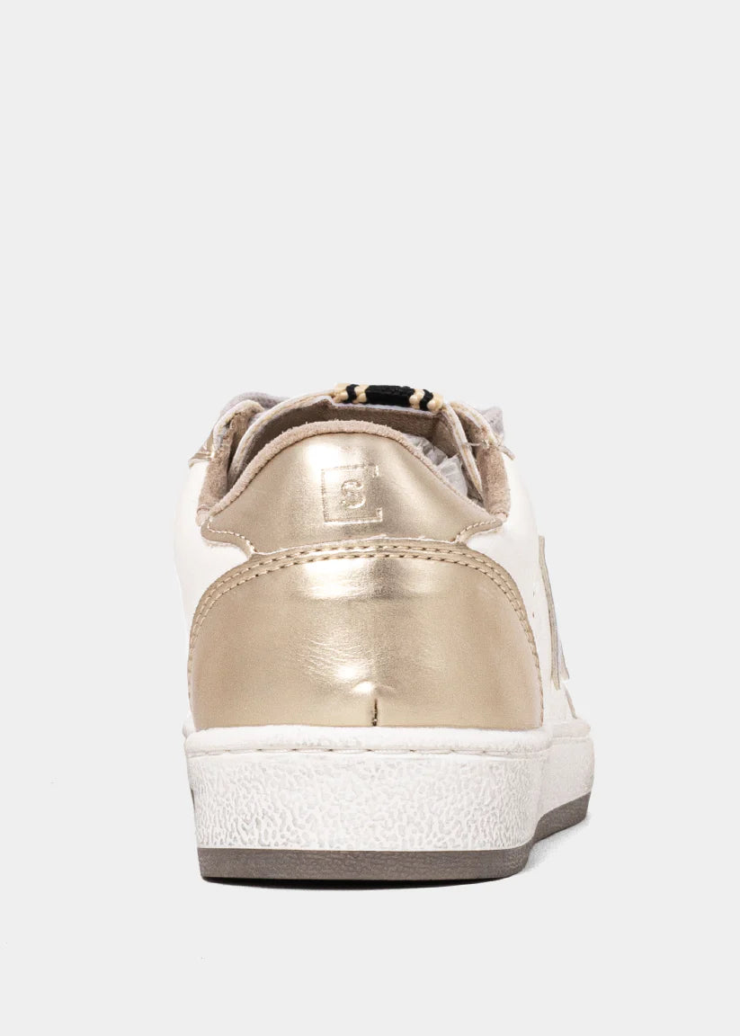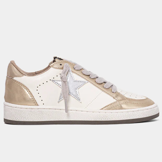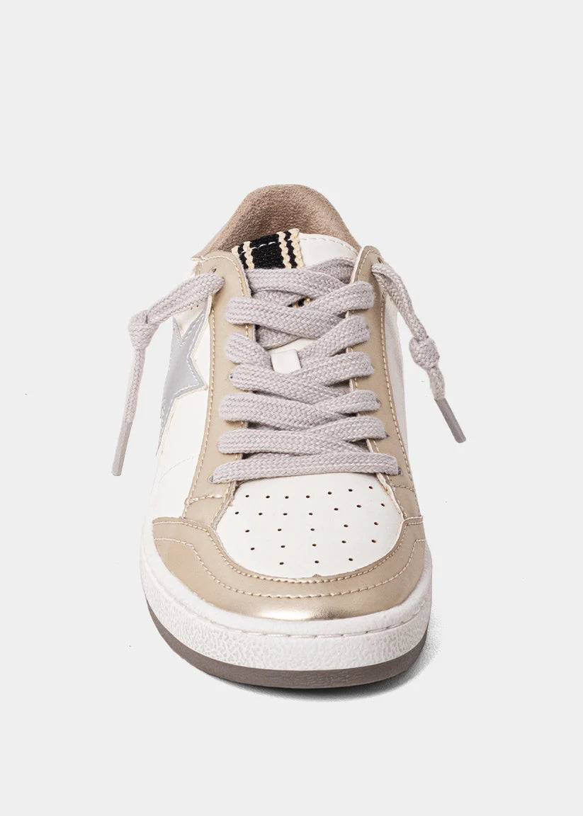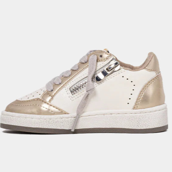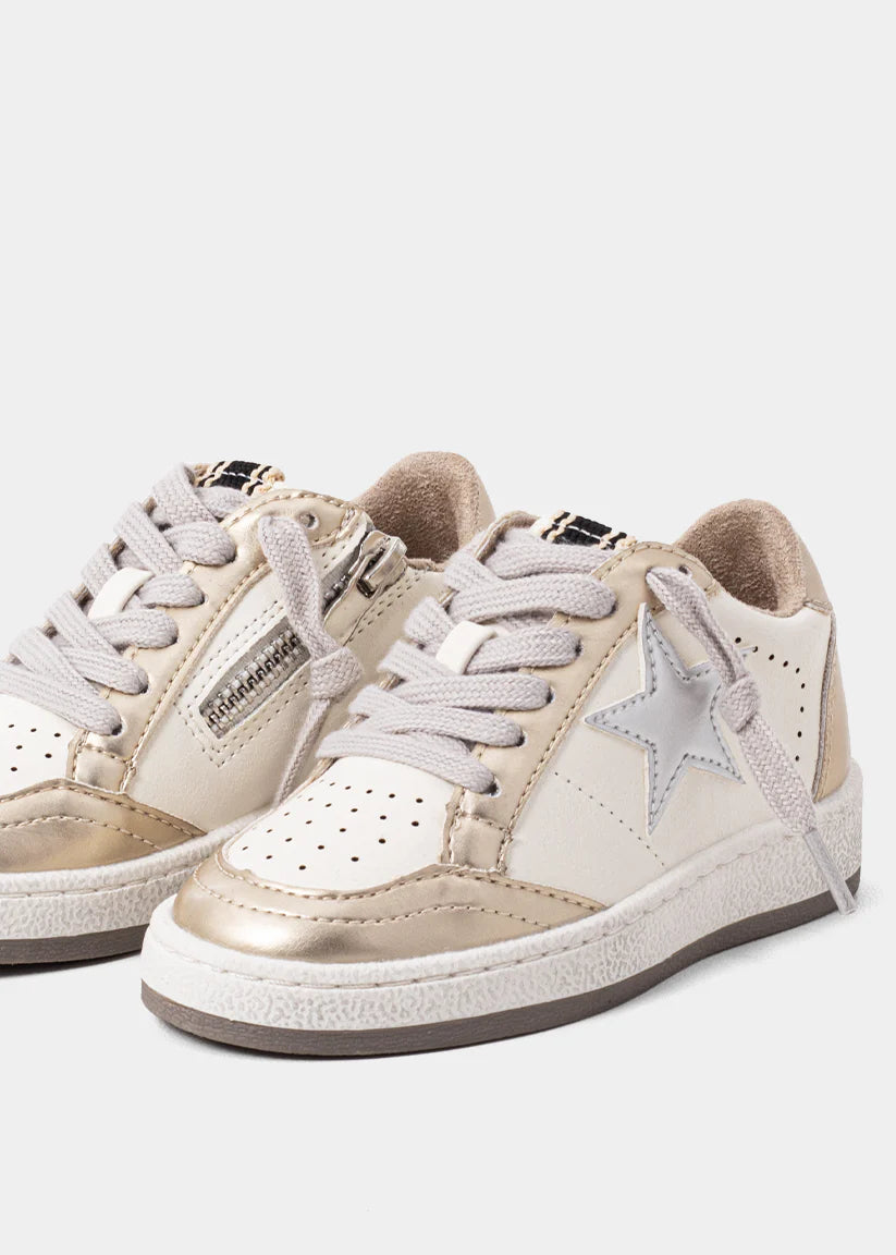 Shiny steps, happy hearts.The PAZ MINI in Golden is made for little ones who love a bit of sparkle and shine. This standout sneaker features a glittery gold upper with star detailing and neutral beige accents for balance. Comfortable, durable, and easy to slip on (thanks to the side zipper in toddler sizes), it’s the perfect everyday shoe that feels like a party.